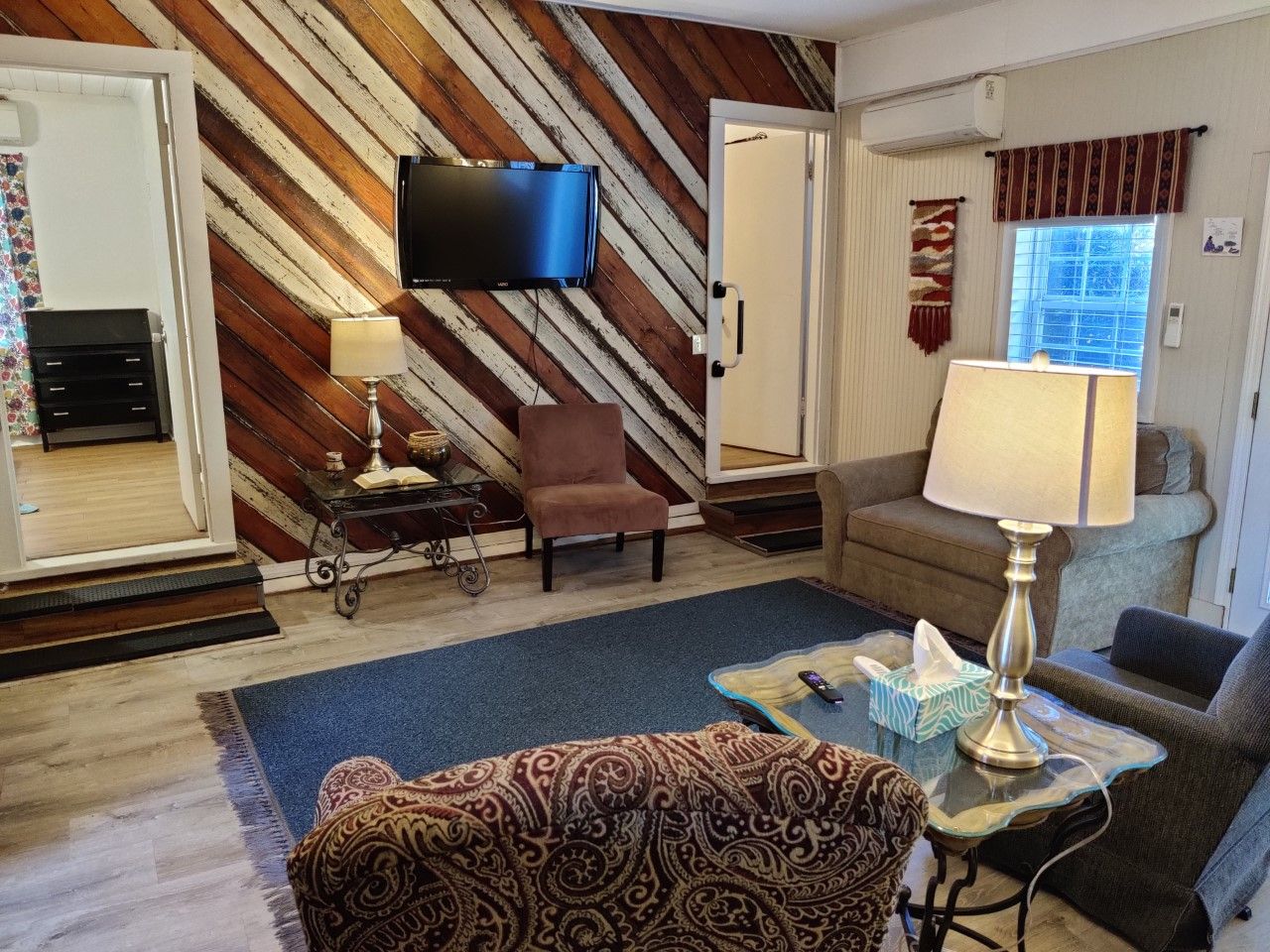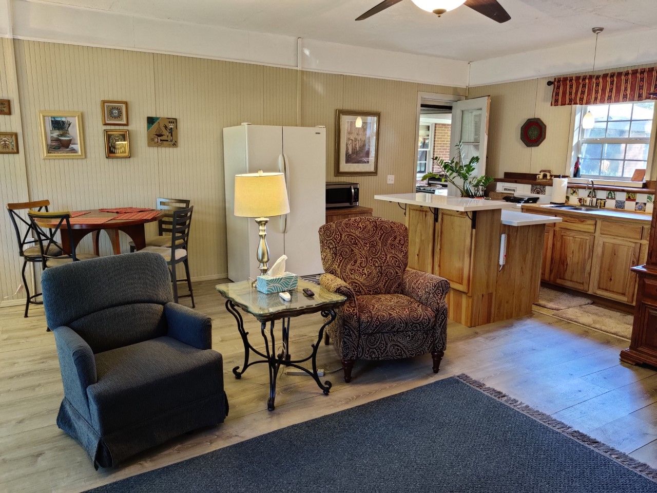 The Great Room is about 400 sq. ft. and contains the living area, dining area, kitchenette, and bathroom. We believe in comfortable furniture, so you will find a recliner, rocker, and a loveseat (hideabed). The TV is wall-mounted and can easily be seen in all areas of the room.