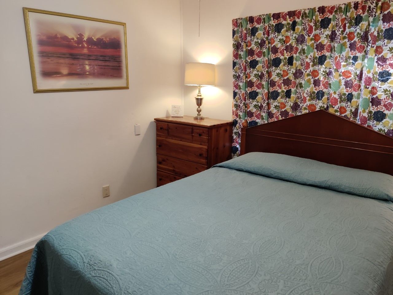 The secondary bedroom has a firm full-sized bed. There is a desk in here for those who feel they just have to work...